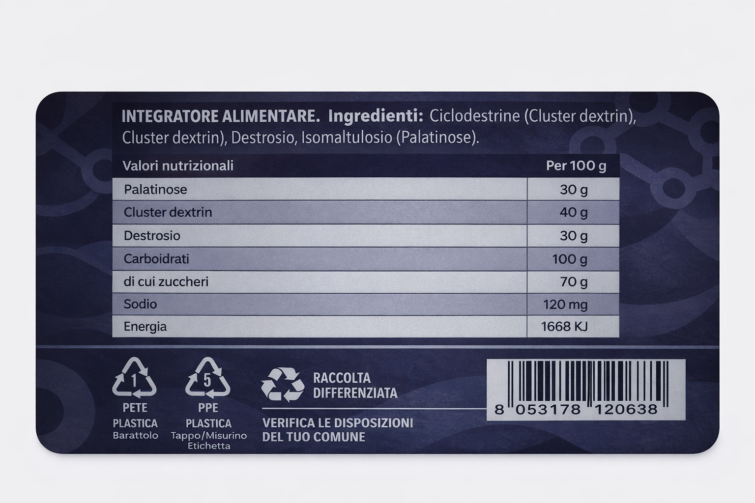 ✅ Ciclodestrine (40 g per 100 g) – Carboidrati ad alto peso molecolare per un rilascio graduale di energia senza picchi glicemici.
