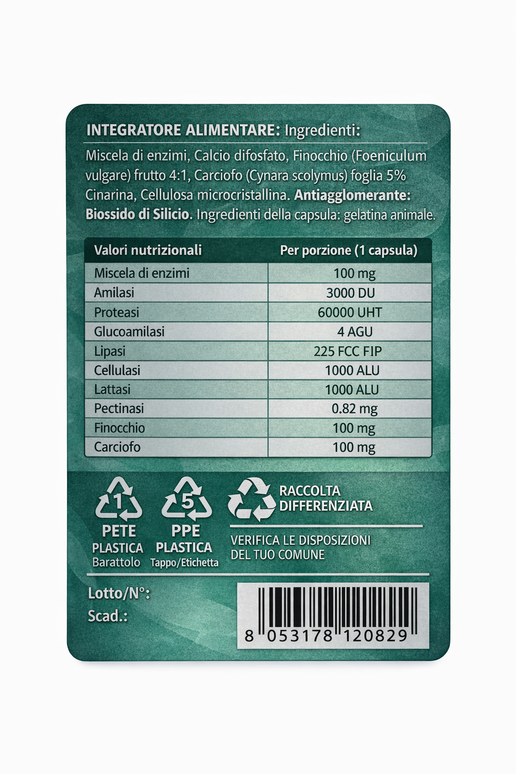 La formula combina enzimi digestivi ad ampio spettro, finocchio e carciofo titolato in cinarina, per favorire una digestione più efficiente e un miglior equilibrio gastrointestinale.